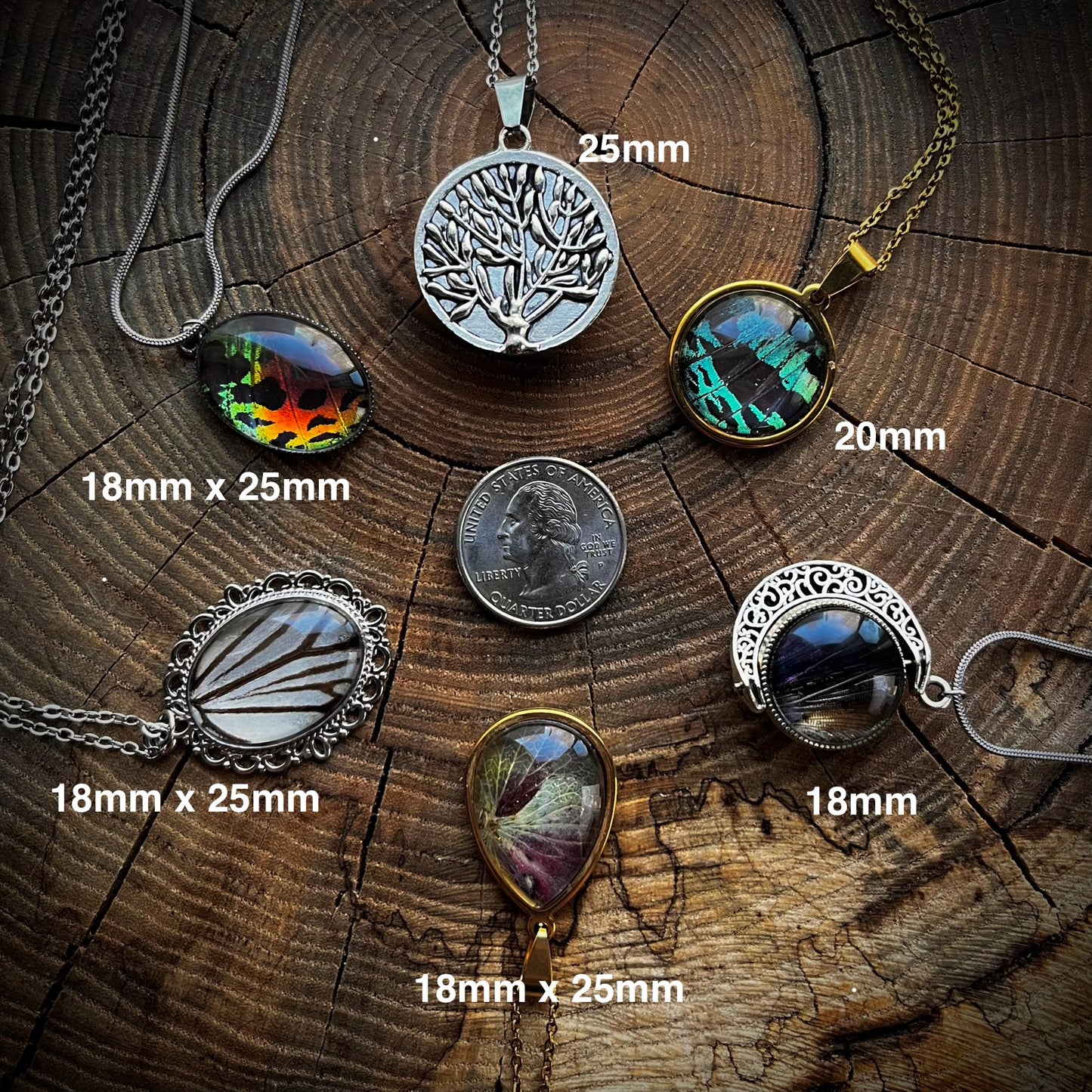 A real Sunset Moth wing from Madagascar encapsulated under glass and set in a gorgeous 20mm round stainless steel pendant.